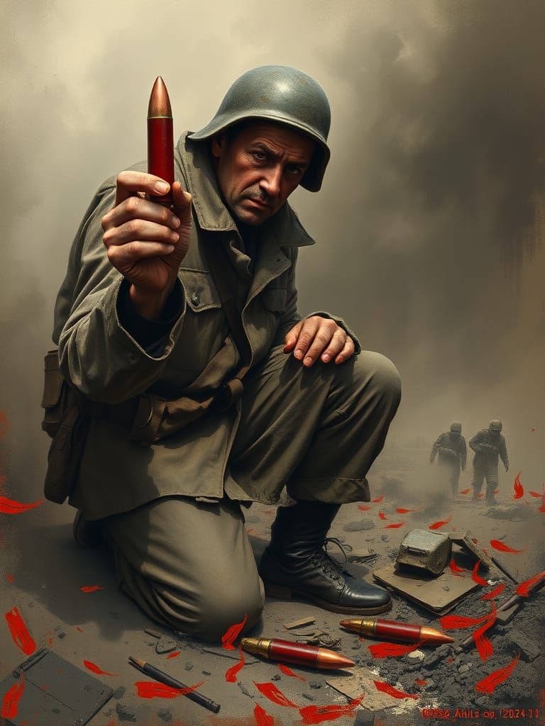 A lone soldier kneels amidst a ravaged landscape, shrouded in ash and smoke, with a vibrant crimson bullet standing out in stark contrast to the desolate surroundings, reminiscent of bold, expressive brushstrokes and gritty textures