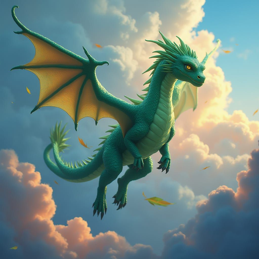 A majestic green dragon soars through a vibrant, iridescent sky. This detailed matte painting features intricate, glowing scales and a complementary color palette of blues and oranges, evocative of fantasy art.