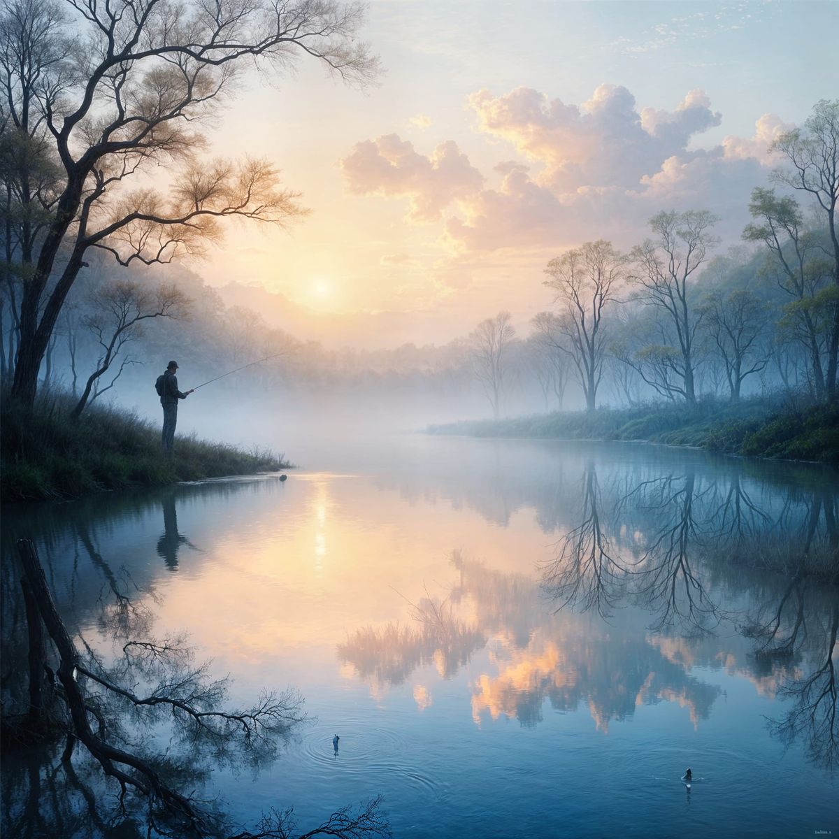 This image shows a lone fisherman on a misty lake at sunrise. Rendered in a painterly impasto style, it captures the quiet stillness of nature with soft pastel colors and realistic textures.