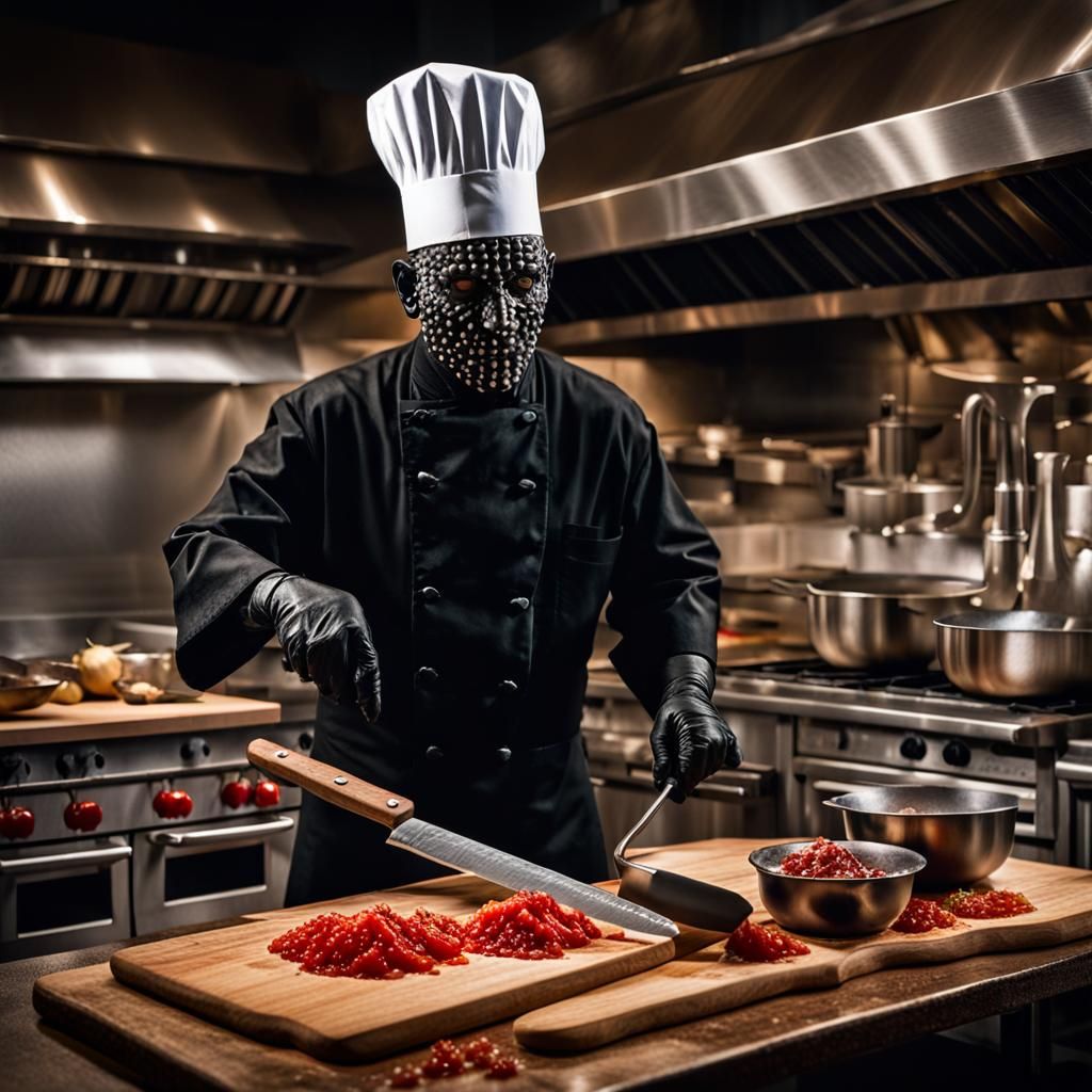 Realistic, full sized Pinhead, From the Hellraiser Movies, wearing a black chef's coat, black apron, and tall black chef's hat, Working in a fine Italian Restaurant Kitchen, preparing a homemade marinara Sauce, by a wooden cutting board with, chef's knife with diced onions and dicedTomatoes in separate ...