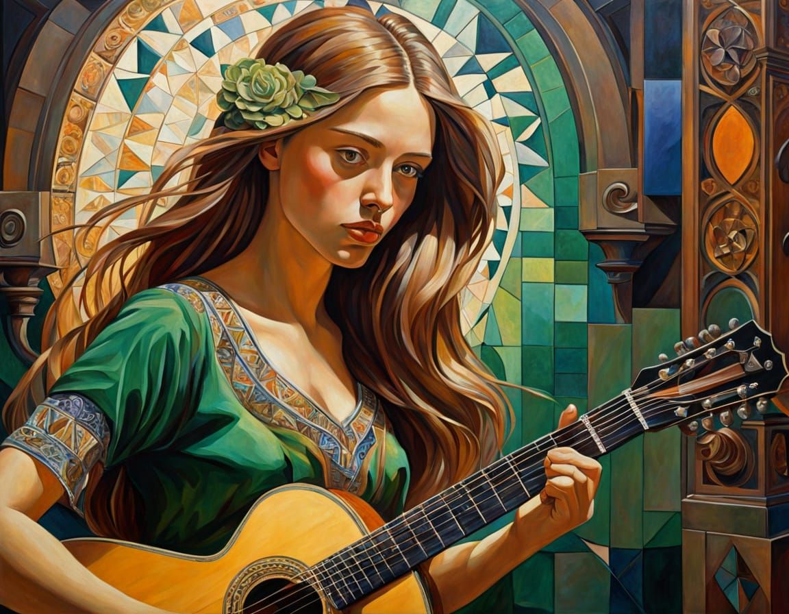 This image is a stunning Cubist oil painting featuring a young woman with long light-brown hair and vibrant green eyes playing guitar. The artwork showcases intricate geometric shapes, ornate decorative elements, and a warm color palette with soft, serene light.