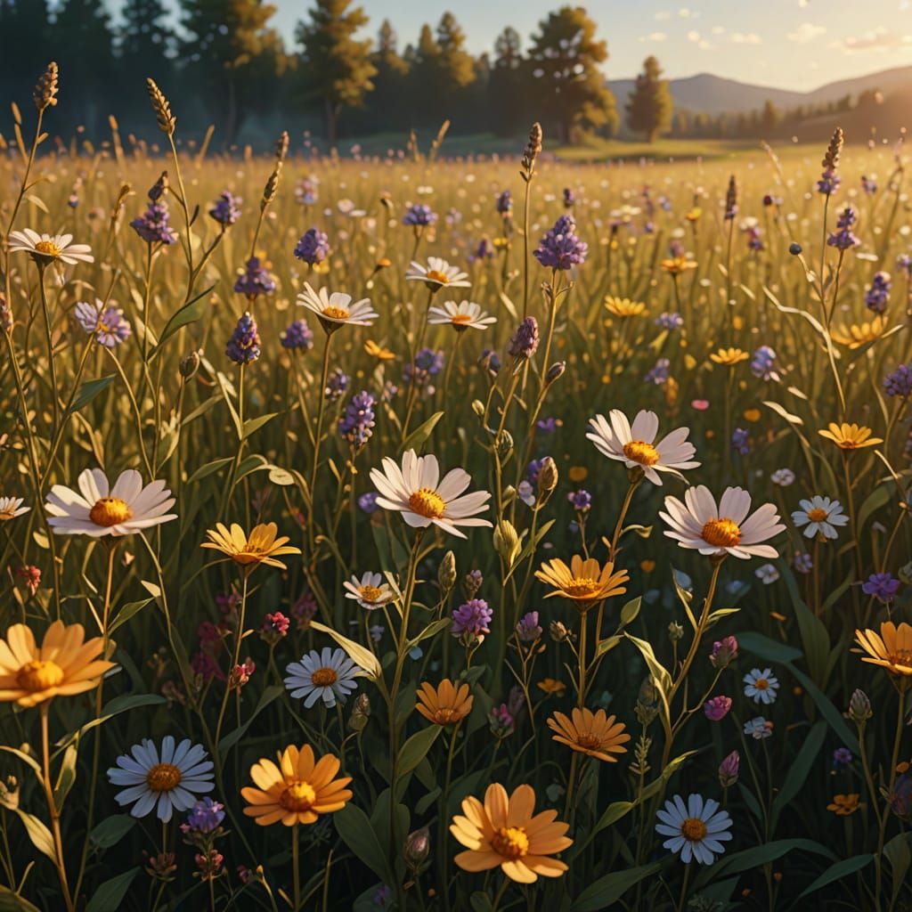 This image shows delicate wildflowers blooming in a field, captured in the warm, soft light of golden hour, with intricate details and rich colors reminiscent of traditional oil painting techniques.