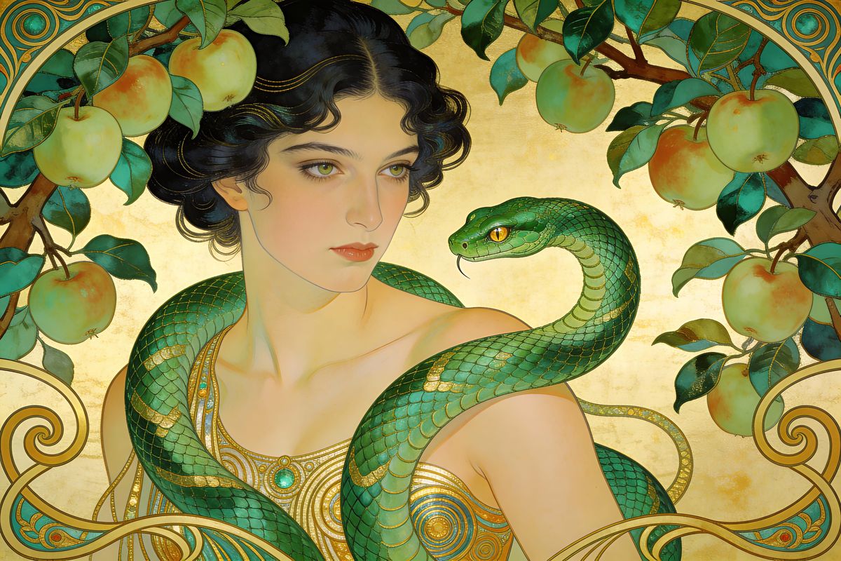 This image depicts a powerful woman with a serpent, framed by stylized apple branches. It features flowing Art Nouveau lines and an emerald and gold palette, evoking feminine strength.