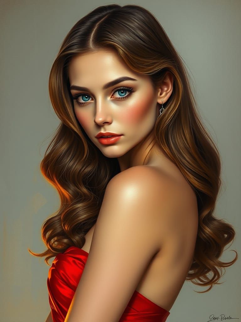 A beautiful young woman with wavy brown hair and blue eyes wears a red dress, bathed in golden light. The image blends luxurious curves and expressive brushstrokes for a captivating portrait.