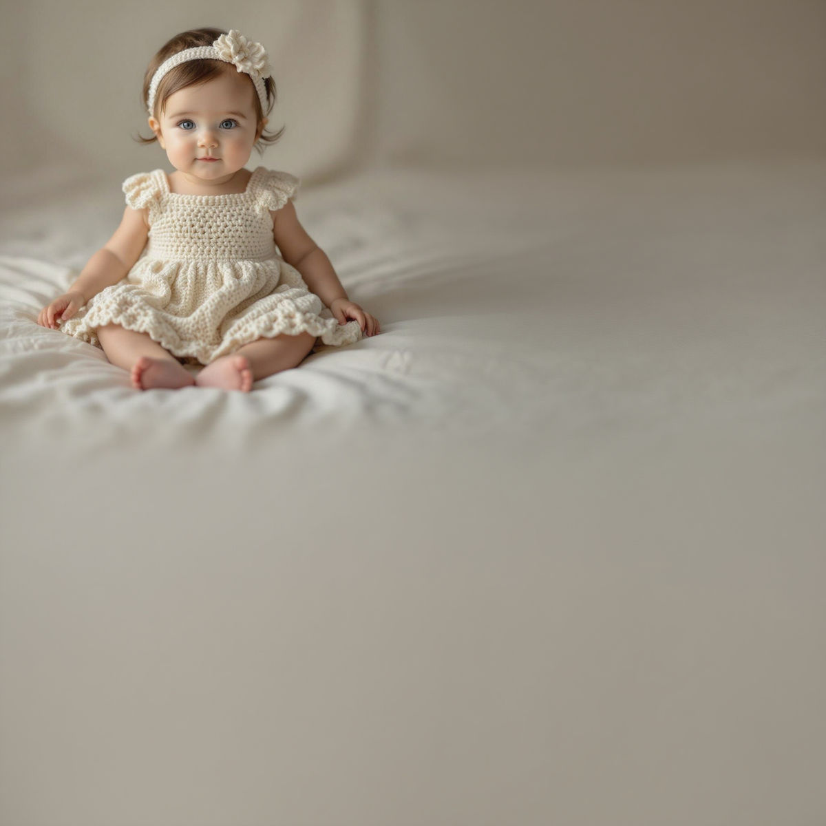 This AI-generated image showcases a hyperrealistic crochet dress worn by a baby. The detailed texture of the crochet is a focal point.