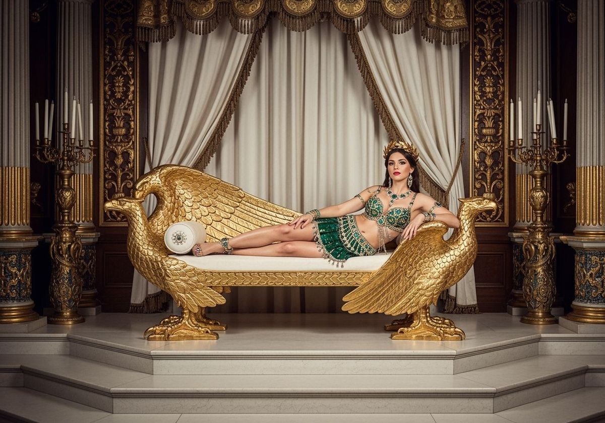 This image shows a Roman Empress in opulent attire reclining on an eagle-shaped chaise longue within an extravagant throne room. The photograph is rendered with natural lighting and sharp focus, reminiscent of digital art.