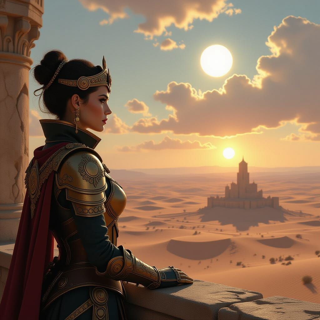 A regal empress in steampunk armor surveys a vast desert from a citadel. The image features twin suns, dramatic shadows, and a classical painting aesthetic.