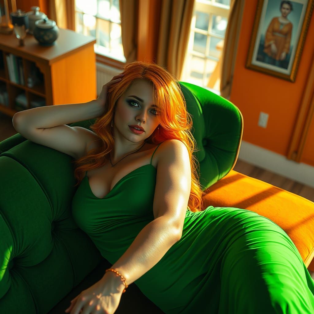 This image depicts a stunning woman in a lush, orange living room, surrounded by intricate details and vibrant colors, evoking a sense of luxury and mystique.