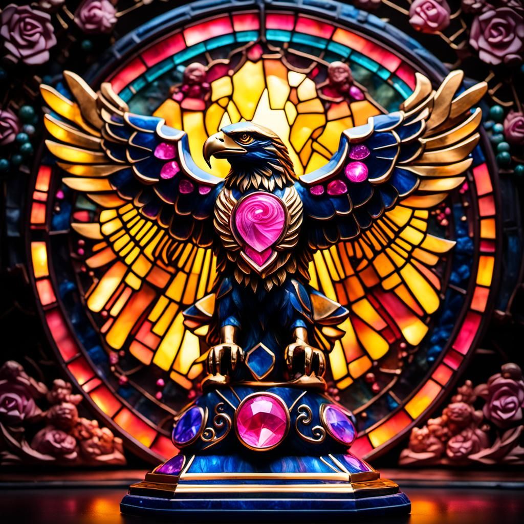 A striking picture of a semi-translucent stained glass eagle statue in pink, gold, and jade tones. Rose gold runes adorn the statue, surrounded by colorful gems and marbles with neon pink lighting, rendered with Unreal Engine 5.