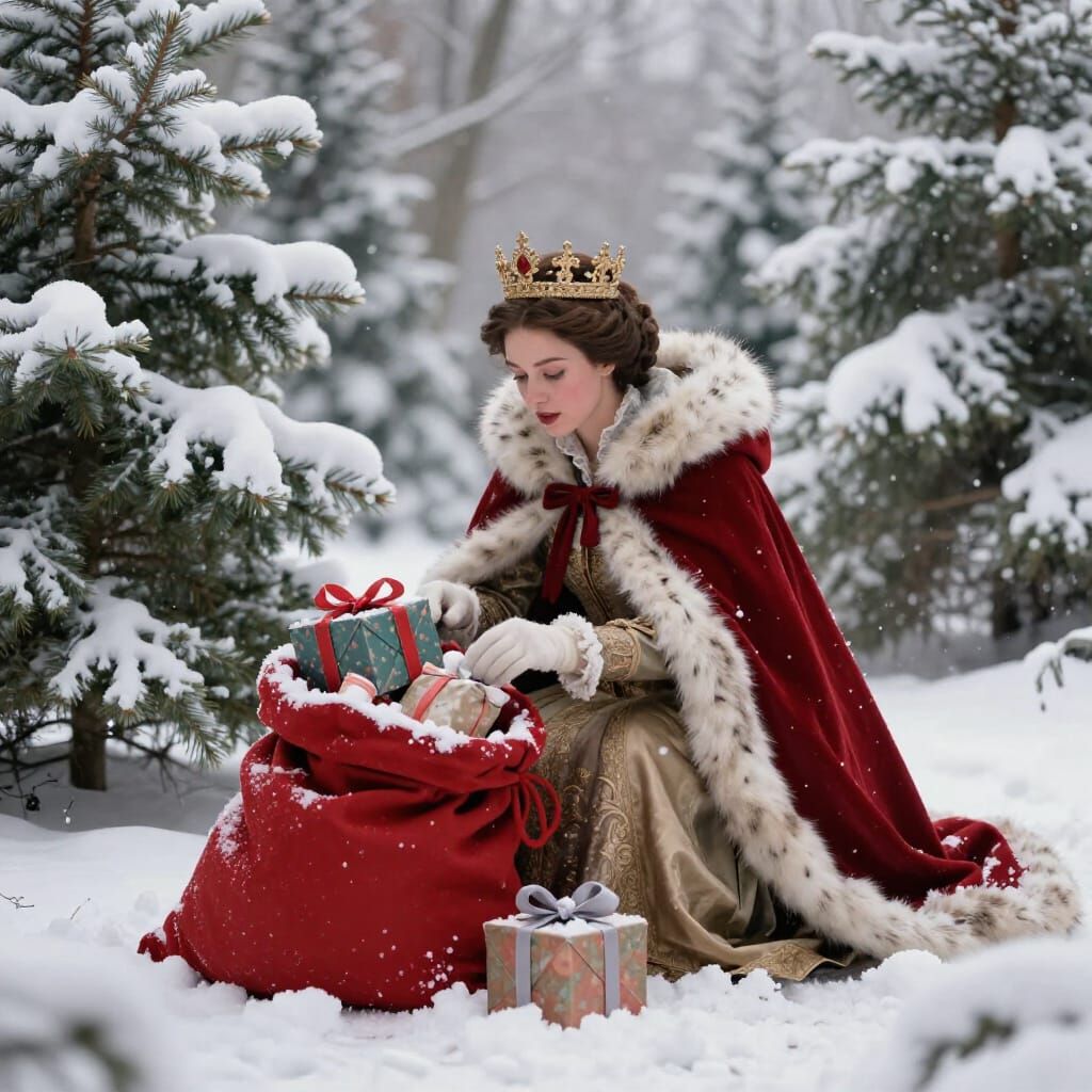 A queen in a fur cloak and crown searches Santa's overflowing gift sack amidst snow-covered fir trees. Digital matte painting with soft winter light and bokeh.