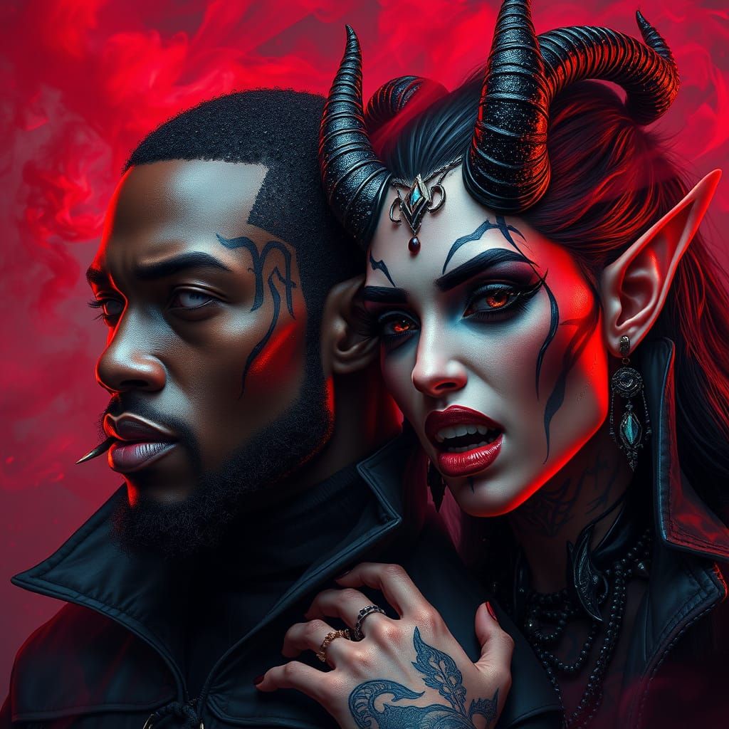 This image shows a dramatic, hyperrealistic portrait of a daring couple in a vibrant, colorful setting. The woman's black and silver hair shines with glitter, and her eyes seem almost unholy. Intricate details and dramatic lighting bring this scene to life, reminiscent of concept art from Simon Stalenhag...