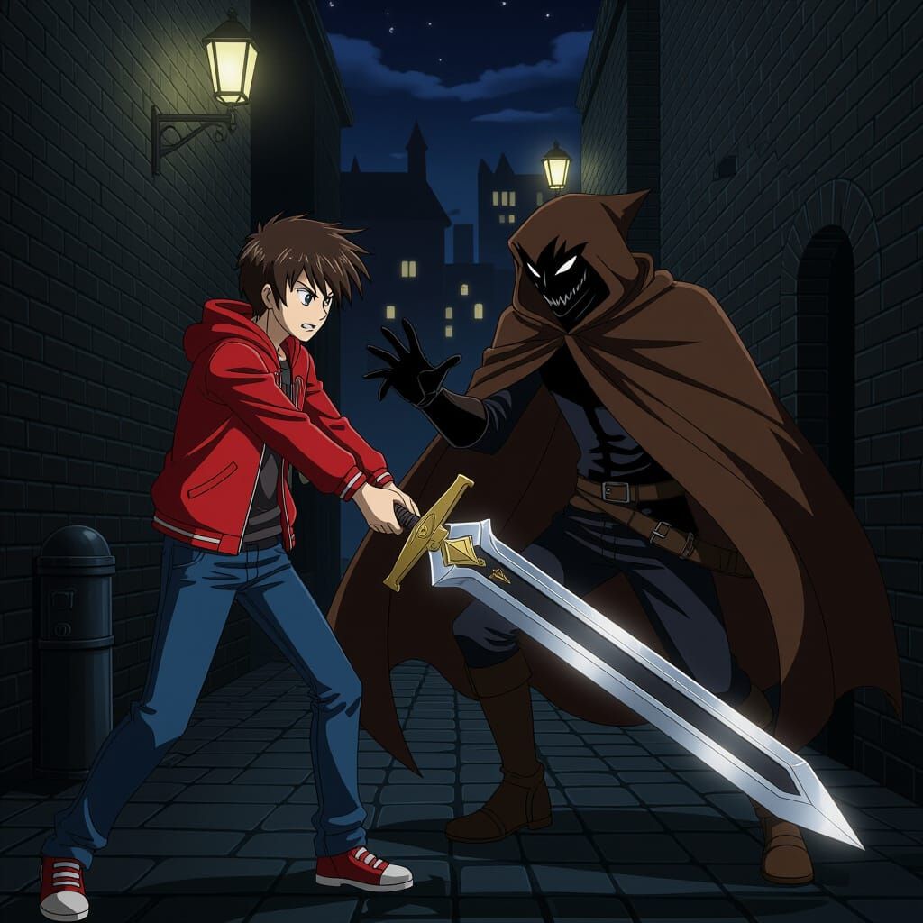 This image shows a teen with a broadsword facing a cloaked dark figure in an alley. The scene is rendered with intense anime styling, reminiscent of dynamic manga illustration.