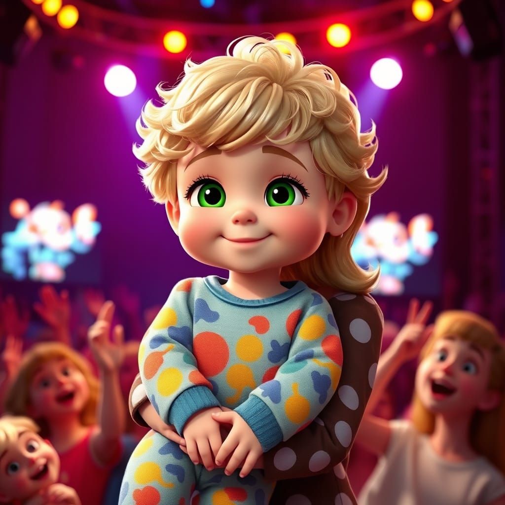 A heartwarming Pixar-inspired image of a chubby toddler boy in colorful dinosaur pajamas, surrounded by lively concert lights and enthusiastic fans, captured in soft 3D animation with playful textures and nostalgic charm.