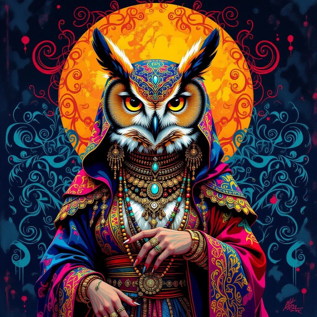 This image showcases an Owl Goddess in ornate attire amidst swirling patterns. It features a dynamic, high-contrast style with spray paint textures and melting effects, reminiscent of digital art mastery.