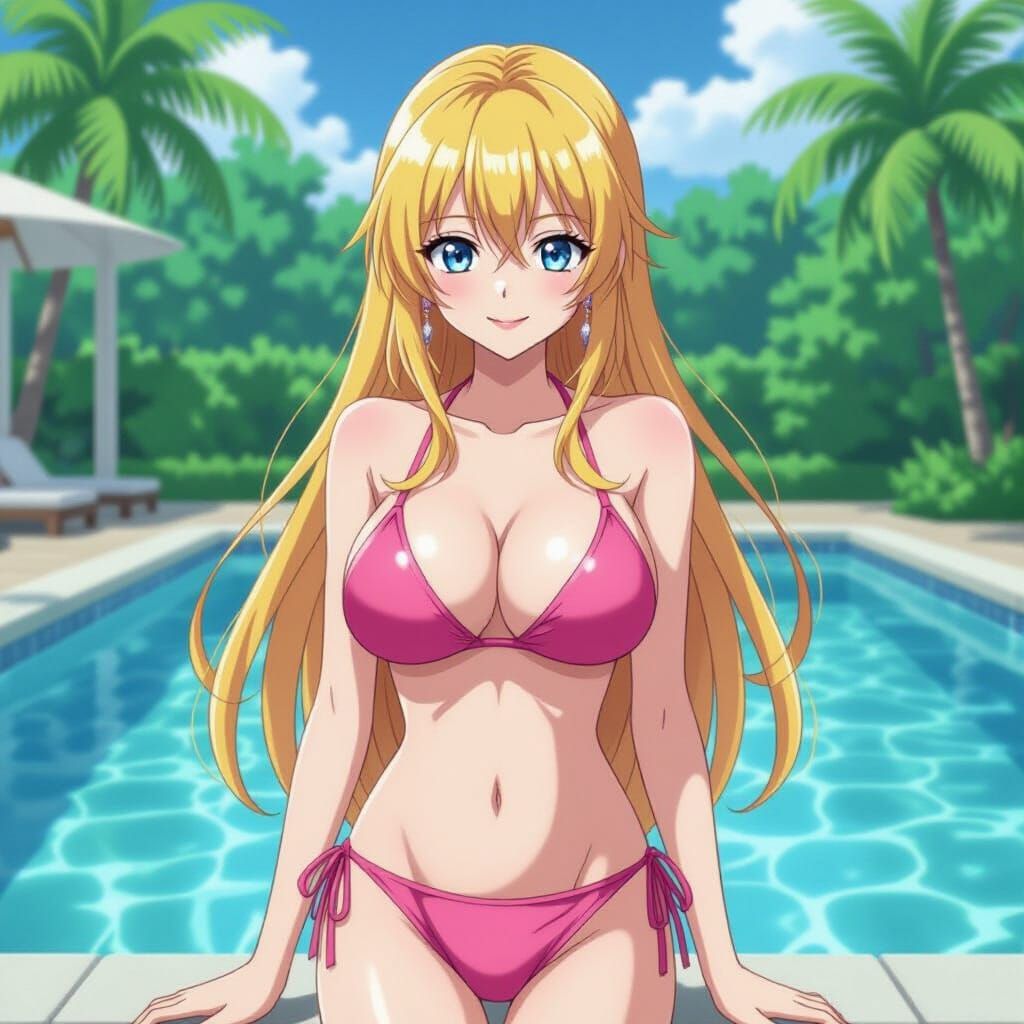 This image shows a blonde anime woman in a pink swimsuit, smirking by a pool. The vibrant, stylized scene is reminiscent of classic anime art styles.
