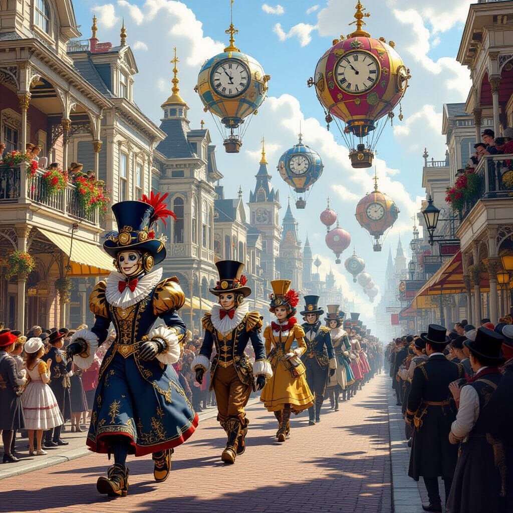 A vibrant steampunk parade fills a Victorian street with automatons, clockwork animals, and pocket watch hot air balloons. Intricate details capture a celebratory atmosphere.