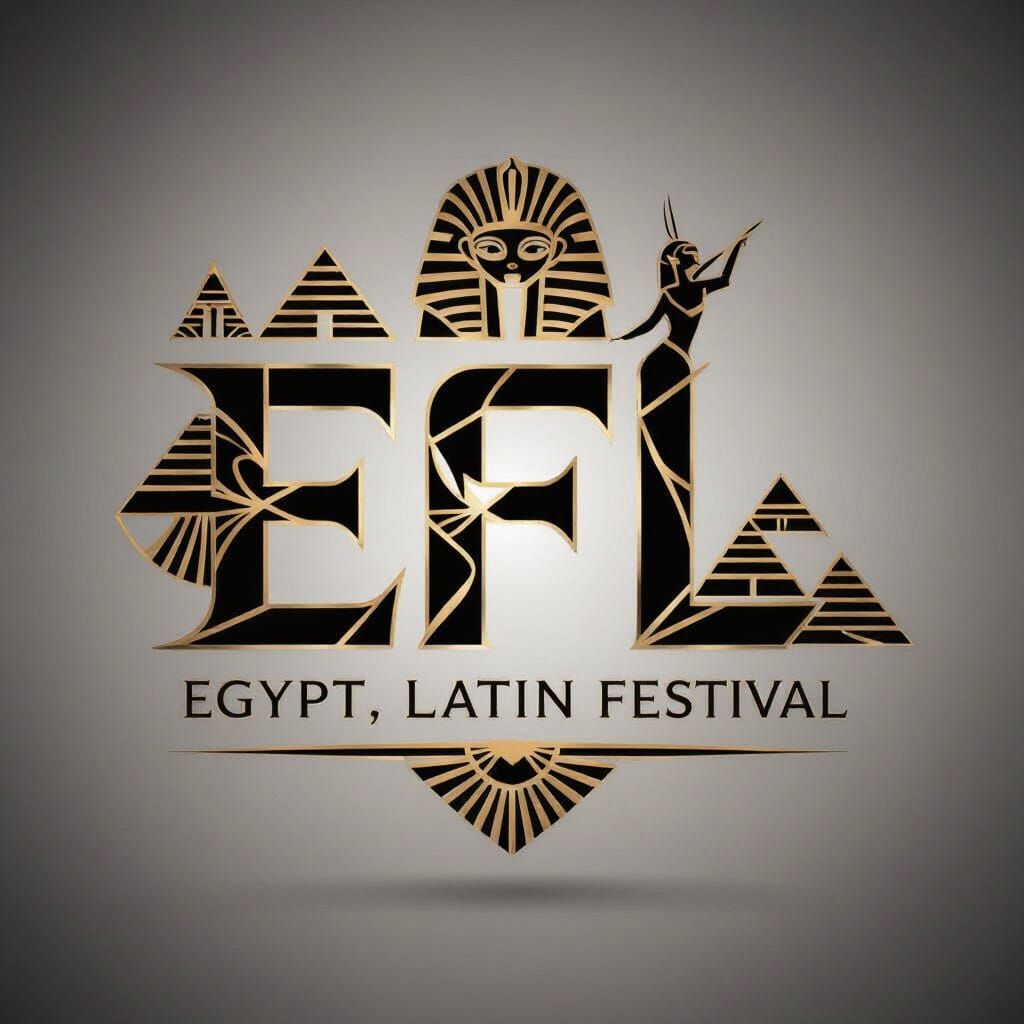 A striking black and gold logo for the Egypt Latin Festival (EFL). This modern graphic design blends abstract Egyptian art with Latin dance vibes, featuring prominent EFL letters and cultural motifs.