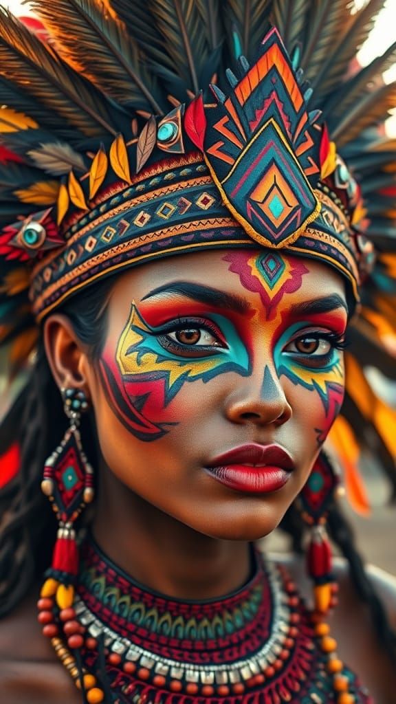 This close-up portrait of a woman showcases vibrant tribal face paint and a stunning headdress adorned with multicolored feathers, set against a warm outdoor light. The image features intricate textures and a confident gaze, blending hyperrealistic skin with bold cultural expression.