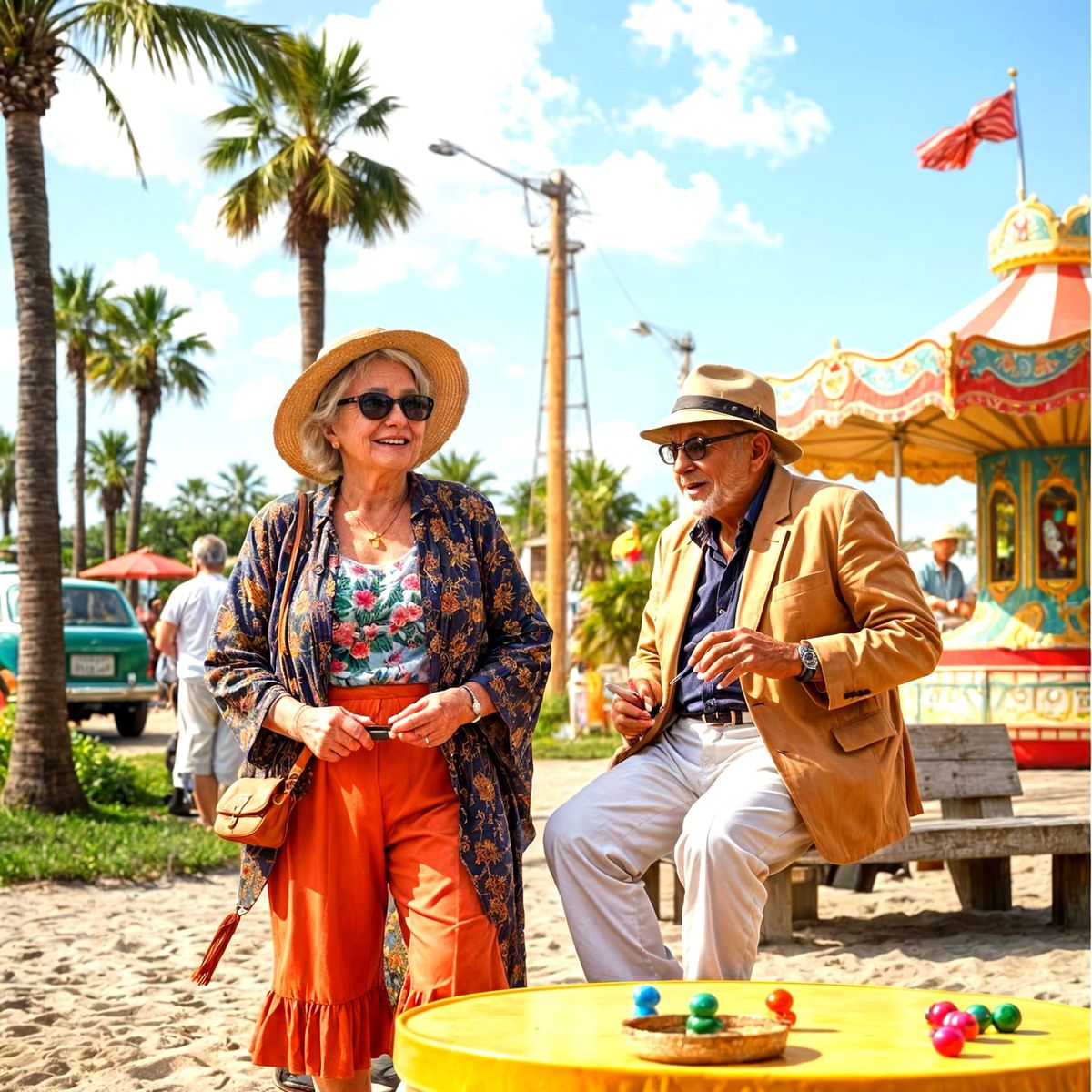 This image shows an elderly couple enjoying a playful day at a vibrant beachside park. The seniors, dressed in stylish outfits, are seen engaging with a whimsical carnival ride.