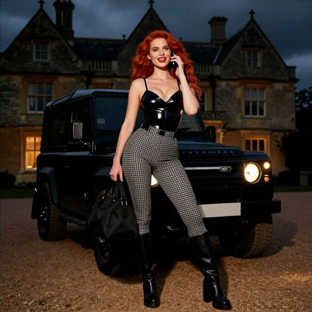A striking image of a self-assured woman in a black latex top and houndstooth pants, standing before an old English manor at night. A black Land Rover Defender is parked nearby, its headlights illuminating the scene.