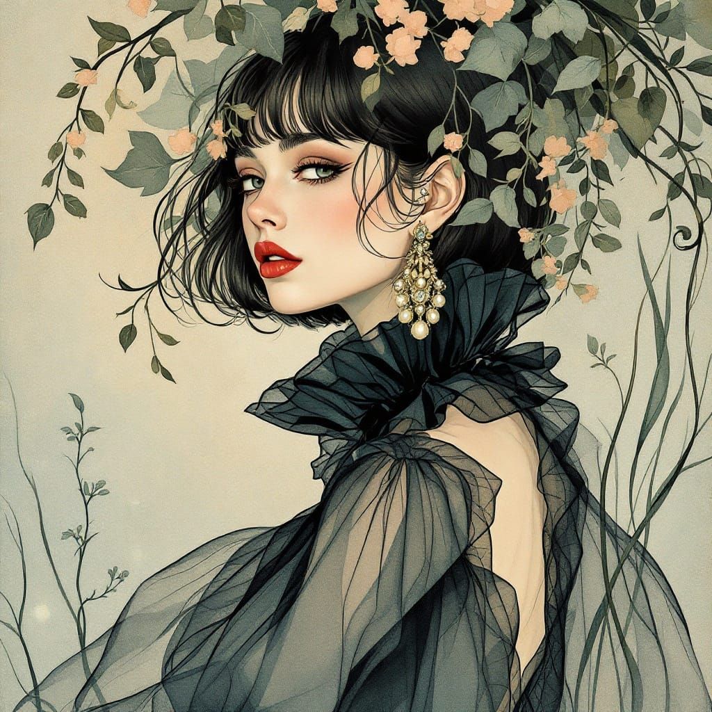 A contemplative woman with delicate features and bold eyes is surrounded by stylized natural elements, blending seamlessly into her dreamlike atmosphere, as Art Nouveau lines and watercolor techniques evoke a timeless, emotional quality.