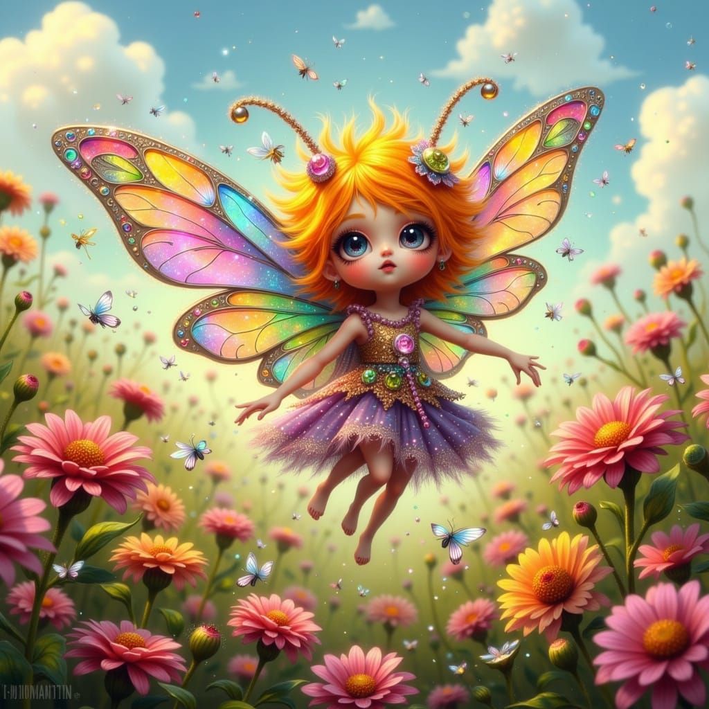 This vibrant, dreamlike image depicts a fantastical creature, composed of glittering gemstones, as it zooms around a sun-drenched meadow with unbridled joy. Adorned in a patterned Gingham-inspired dress, the creature's opalescent wings glimmer with a soft, luminous glow.