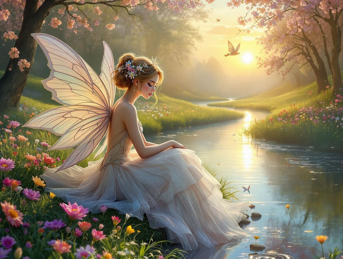 This enchanting image depicts a serene fairy in a sparkly, iridescent gown, surrounded by a vibrant spring forest teeming with life and colorful blooms, with a winding river reflecting the warm hues of a sunset.