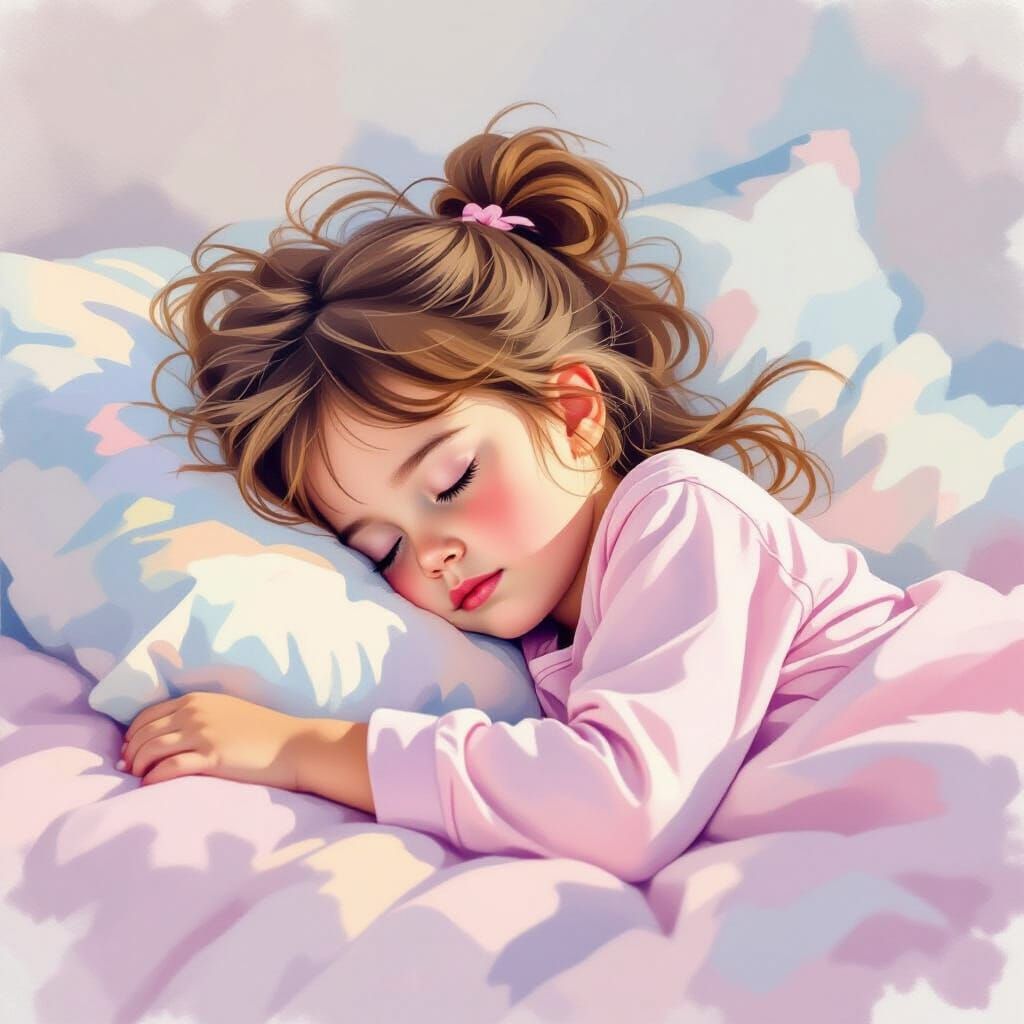 This ultra-detailed watercolor painting shows a little girl with messy brown hair sleeping soundly in pink pajamas. The scene features soft, bleeding colors and visible brushstrokes, creating a dreamlike atmosphere.