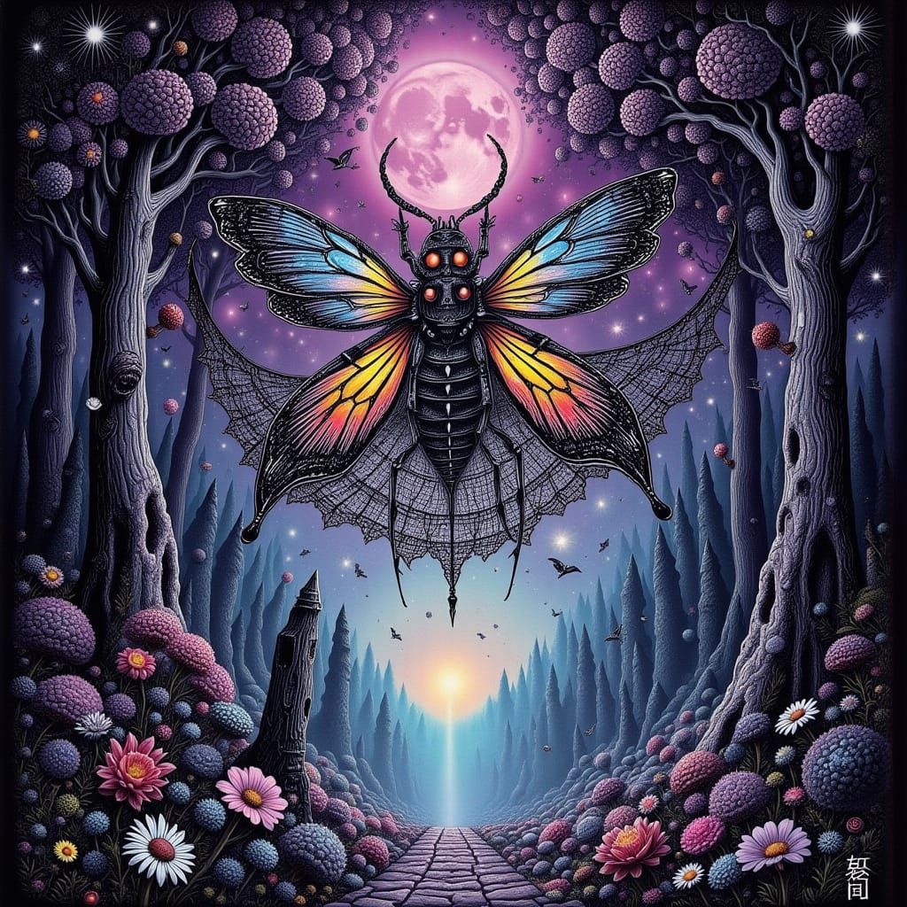 This image depicts a massive, glowing beetle with shimmering wings perched on a large spiderweb among old trees. A surreal, cosmic scene with vibrant colors and an otherworldly glow, created in a digital airbrush style.