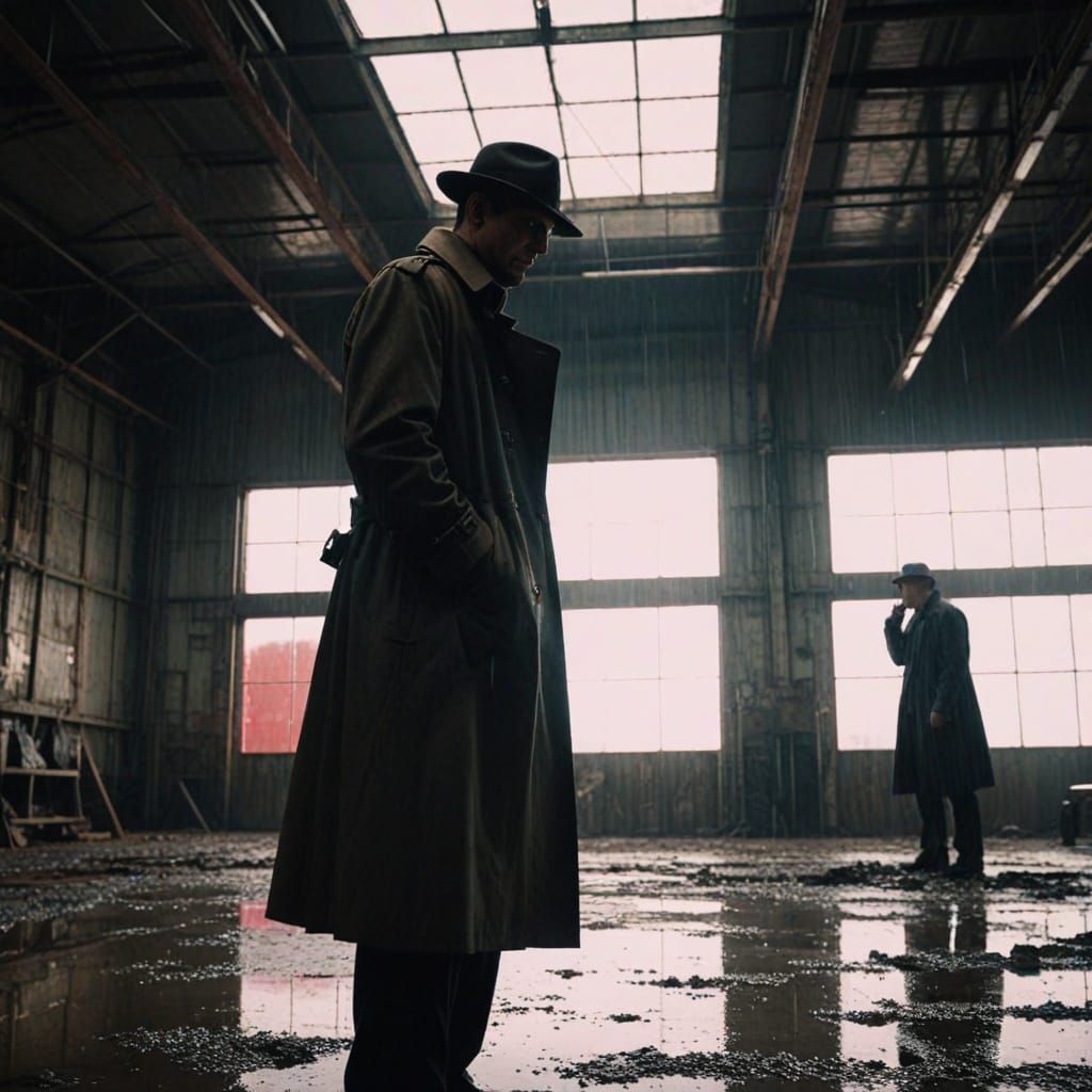 A detective examines an armored core in an abandoned hangar in this graphic novel-style film noir image. Shot in dim red lighting with dark shadows to enhance the moody, suspenseful atmosphere.