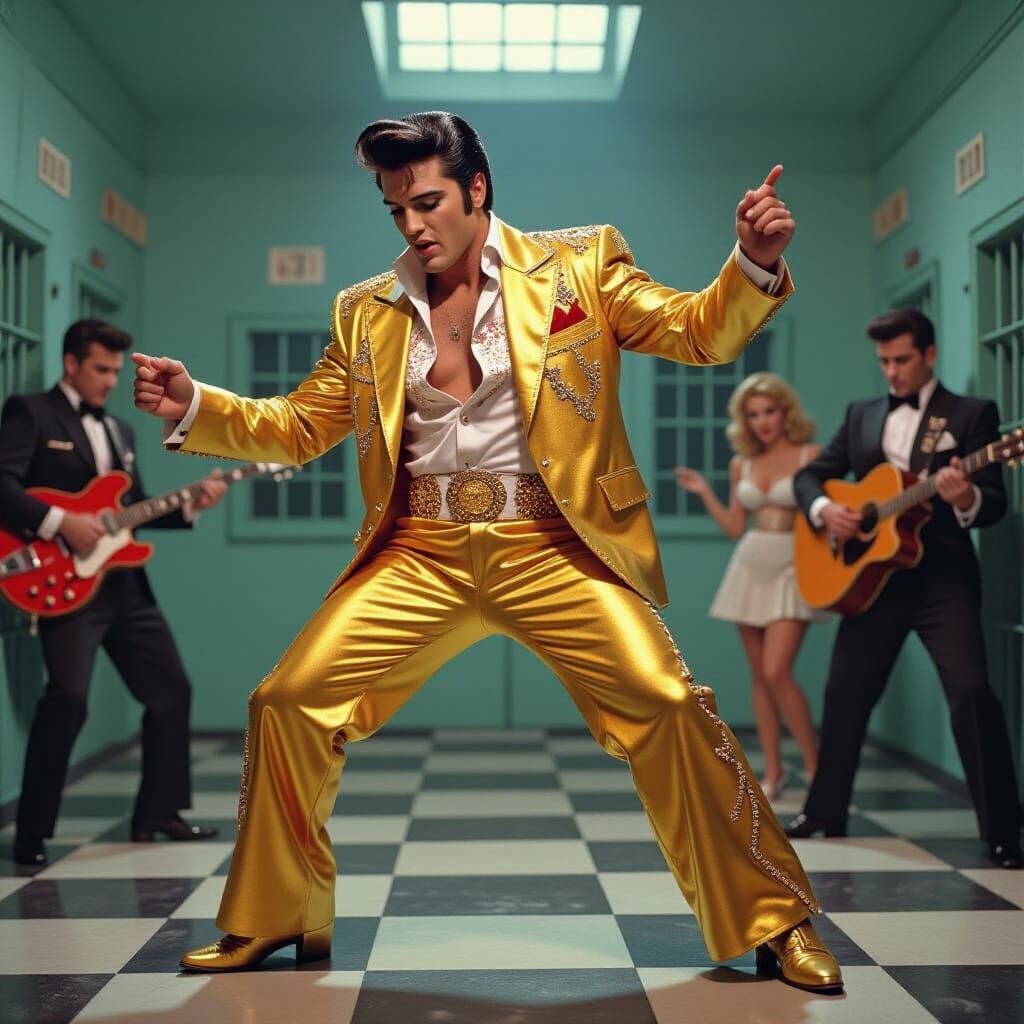 A vibrant image of Elvis Presley in his gold lamé suit, dancing in a 1950s prison. The artwork features bold lines and vibrant colors with rockabilly and noir aesthetics.