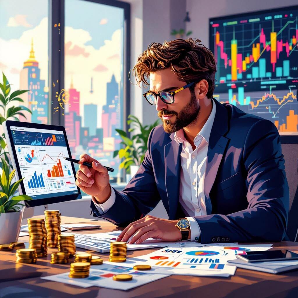 This image shows investors in a modern office analyzing financial data. The scene is rich with coins and charts, rendered with vibrant colors and brushstrokes reminiscent of digital art.