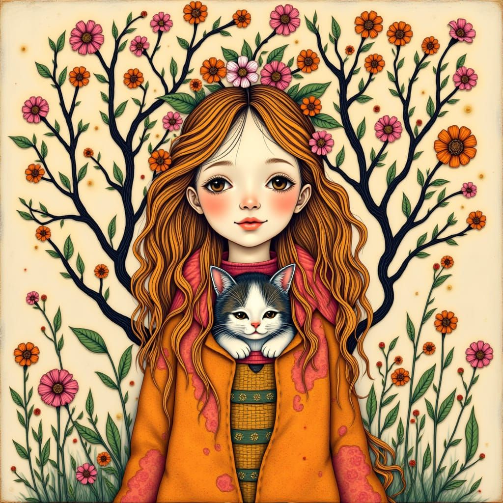 This image features a whimsical, folksy lady with long hair, dressed in pink and yellow, holding a cat. Orange hues appear beneath flowering branches, creating a feeling of quiet happiness. The art style has painterly textures.