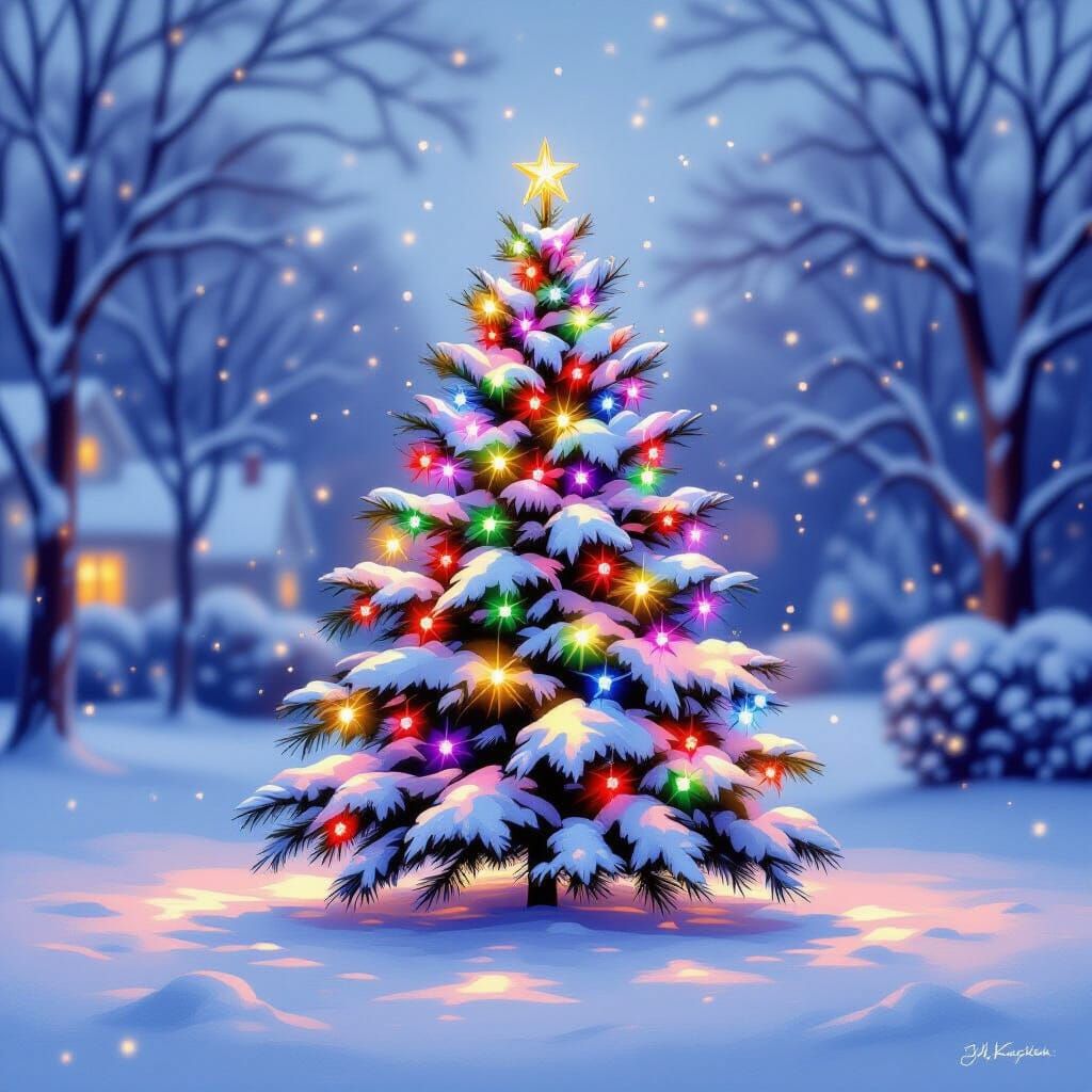 This image shows a stunning Christmas tree covered in multicolored lights, set in a snow-covered yard. A soft, diffused glow creates a magical and serene holiday atmosphere, rendered in a cozy, illustrative style.