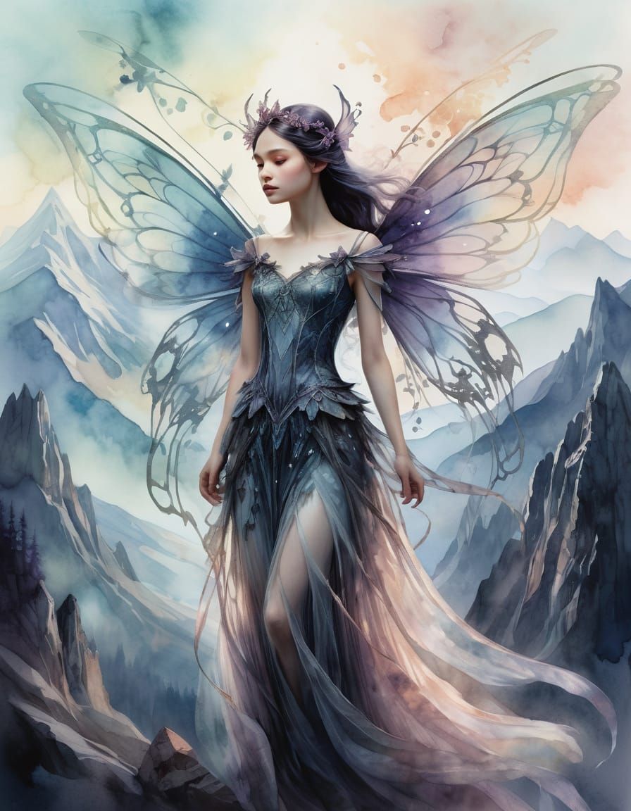 This image shows a colossal, ethereal fairy with gothic adornments, dwarfing a mountain range. Rendered in a stylized watercolor technique with delicate brushstrokes and a pastel palette.