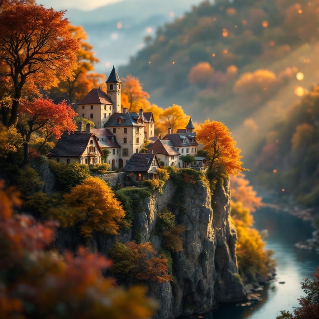 This image showcases a stunning miniature of Saint Cirq-Lapopie, France, perched on a cliff in autumn. It features cozy golden light, misty atmosphere, and lush red leaves, rendered in a detailed digital matte painting style.