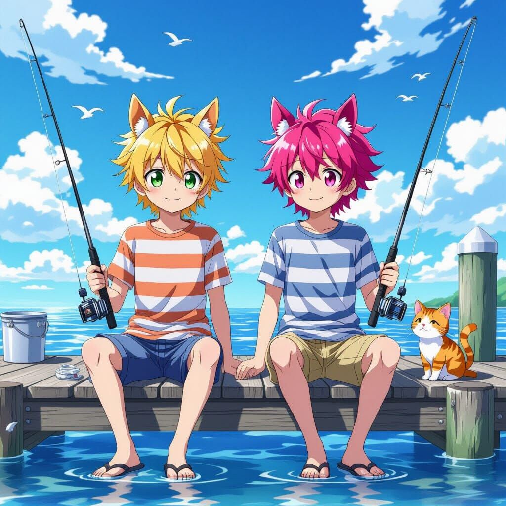 This image shows two anime boys with horse ears fishing on a pier at dawn, joined by a cat. The image is rendered in a cel-shaded anime style with bright colors.