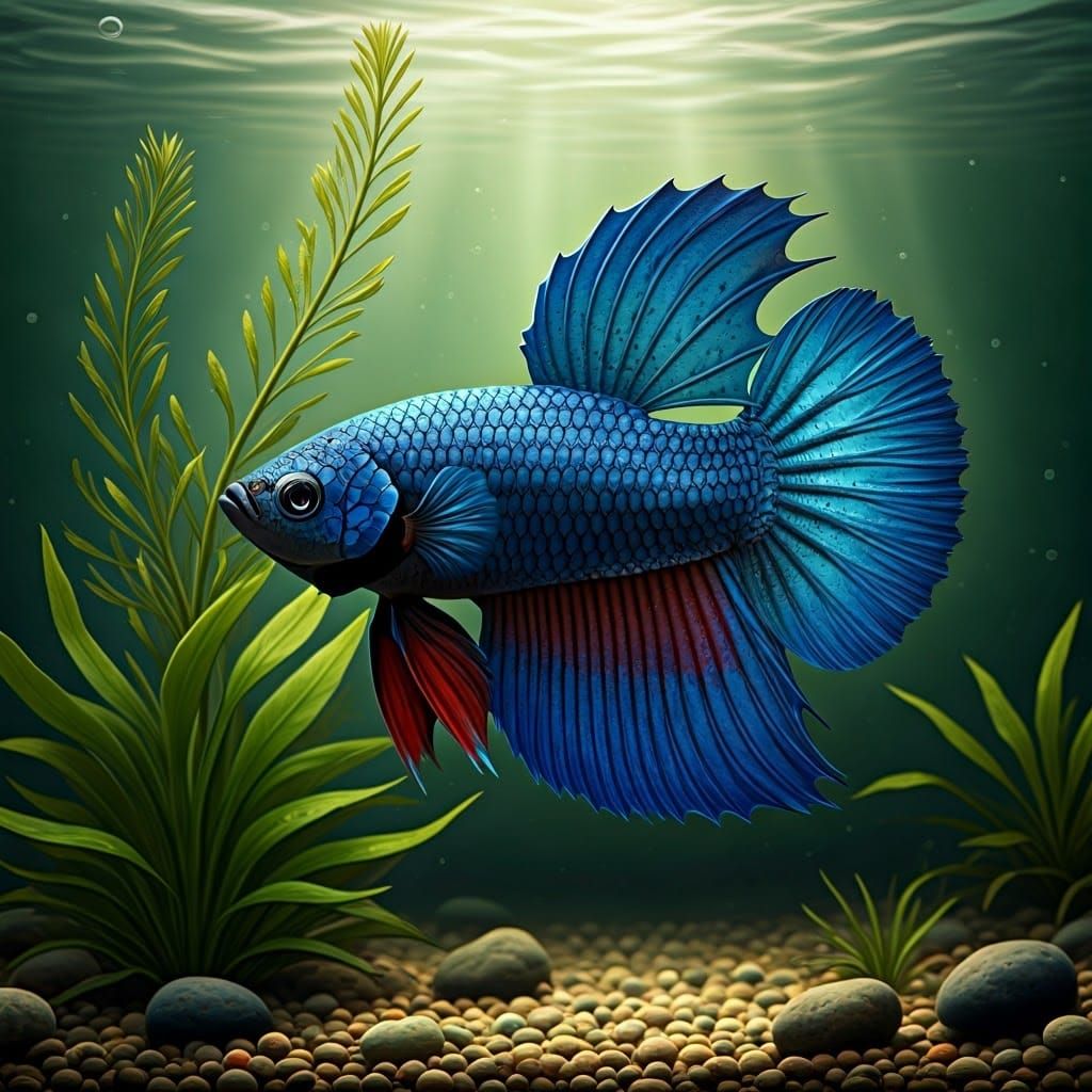 This image shows a detailed, realistic underwater scene of a baby blue betta fish swimming near aquatic plants, with intricate scales and fins, in a style reminiscent of zoological illustrations with vibrant colors