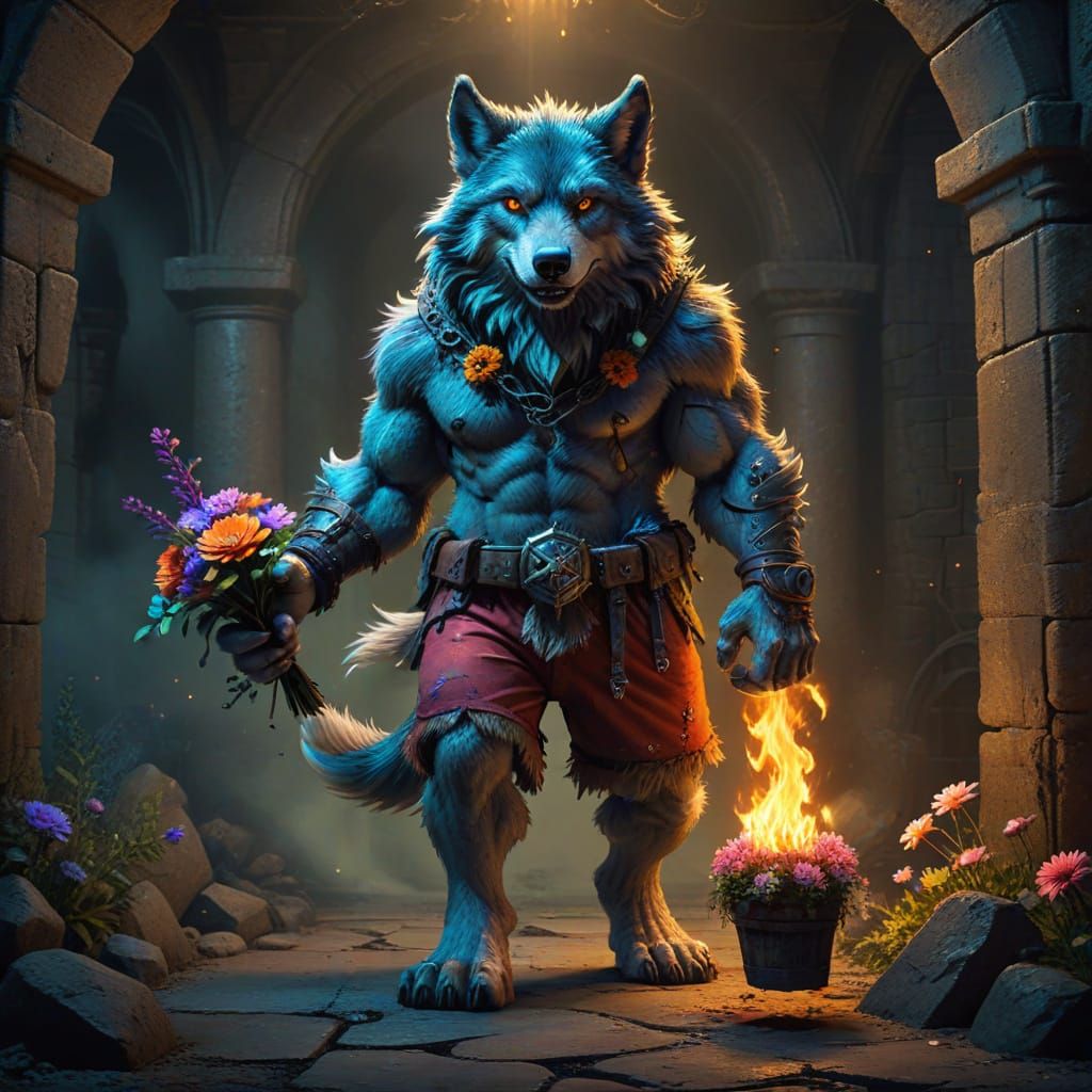 This image shows a large, hairy wolf in worn shorts, holding a small bouquet of flowers. It stands in a dungeon illuminated by torches, rendered in vibrant colors with an airbrushed digital art style.