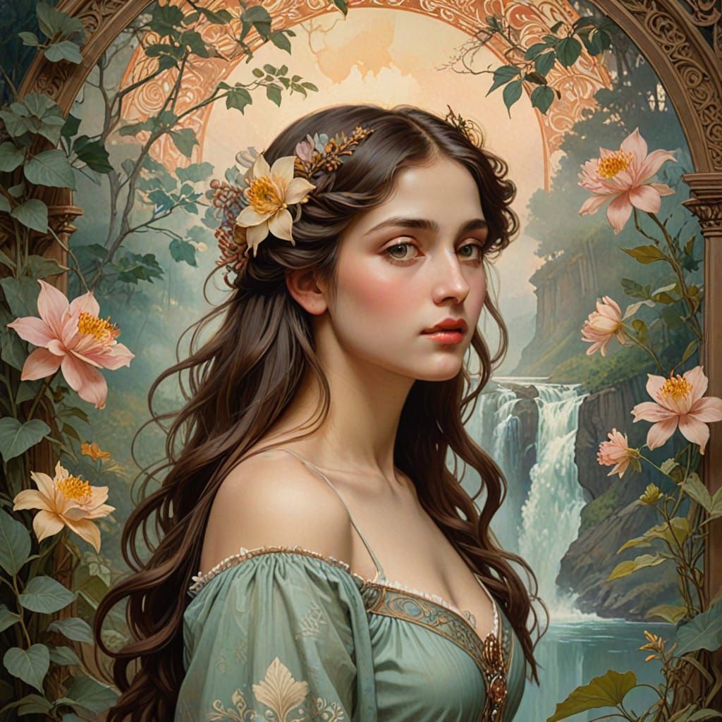 This image depicts a mystical being surrounded by swirling patterns and lush natural elements, symbolizing the impermanent nature of existence. The artwork blends Indian classical and European Romanticism with the dreamy quality of abstracts, capturing the ephemeral essence of the ego.