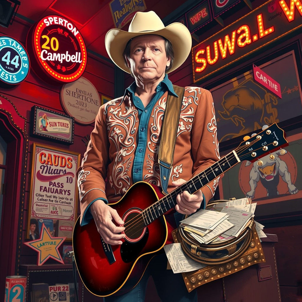 A vibrant illustration inspired by Glen Campbell's "Rhinestone Cowboy." The artwork captures the essence of fame and the isolation that can accompany it, rendered in a pop art style.