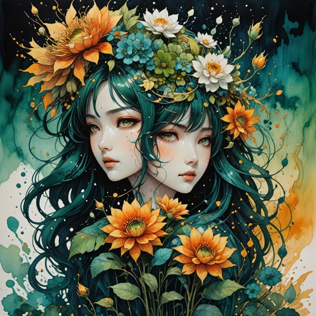 64 megapixels perfect composition, high contrast, cinematic, atmospheric maximalist epic dark green blue brown orange yellow gold cool colorgrading watercolor, wet brush, warm light, wet wash wet on dry, dark color, deep depth, color shading depth, ink details, pen ink and watercolor, low angle, flowers, ...