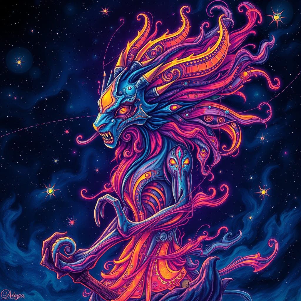 This vibrant, holographic illustration of a wild spirit captures the essence of mystical, otherworldly energy, blending traditional and digital media in a dynamic, cosmic scene with neon accents and ethereal textures.