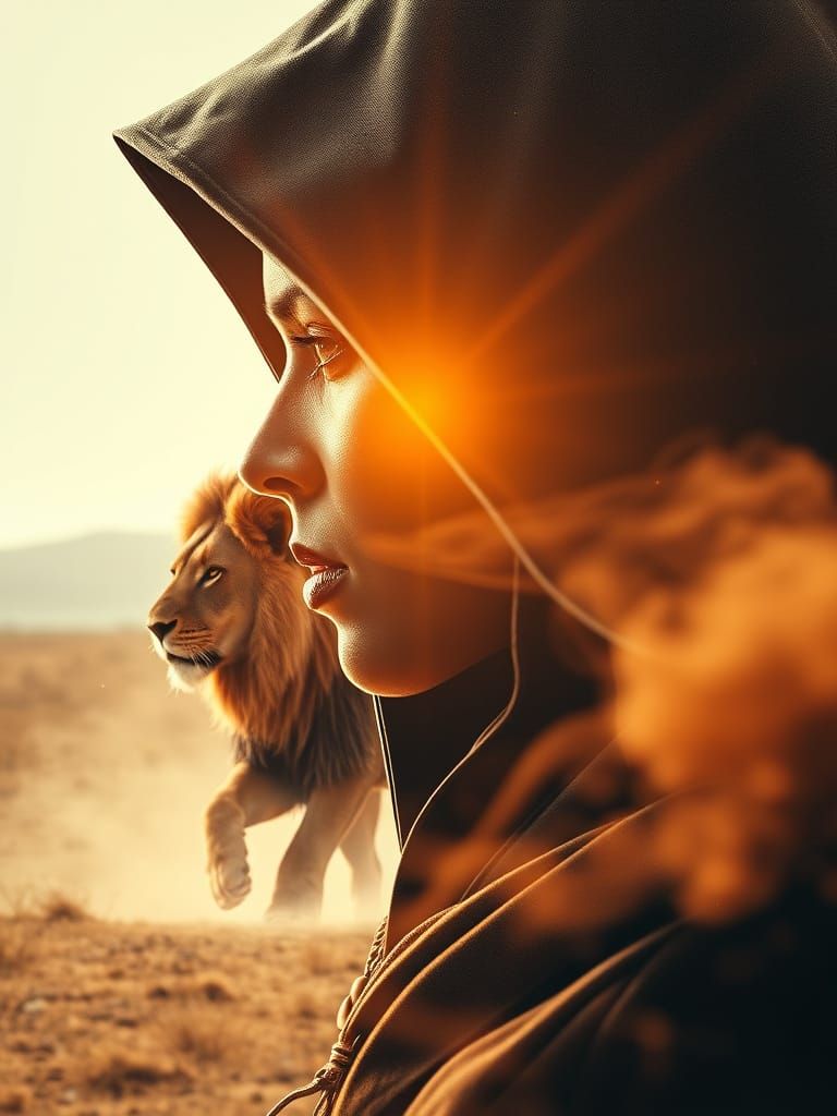 This digital artwork features a hooded woman in profile, merged with a vast savannah. A lioness walks in the background, with dust and sun particles creating a dreamlike atmosphere.