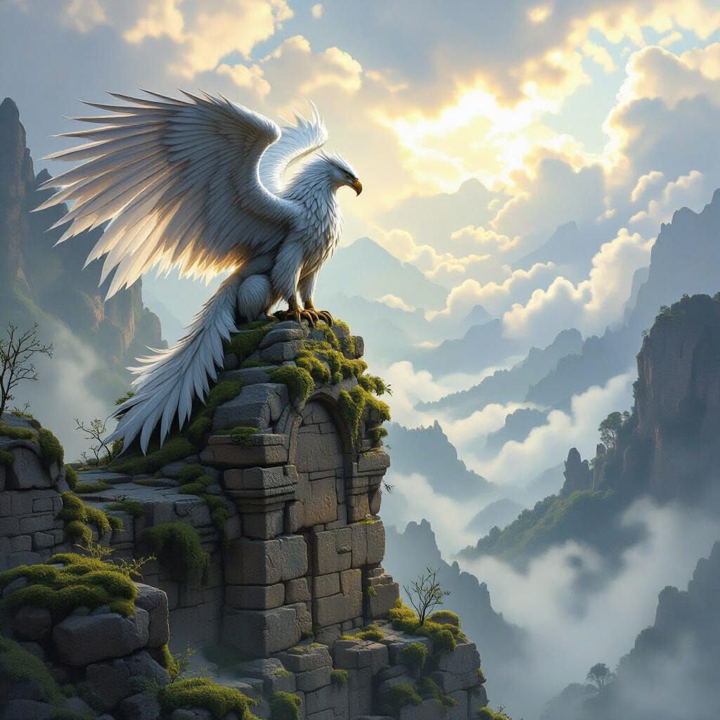 A striking picture of a griffin overlooking a misty valley from atop a crumbling ruin. Sunlight illuminates the scene with dramatic lighting, in an epic fantasy concept art style.