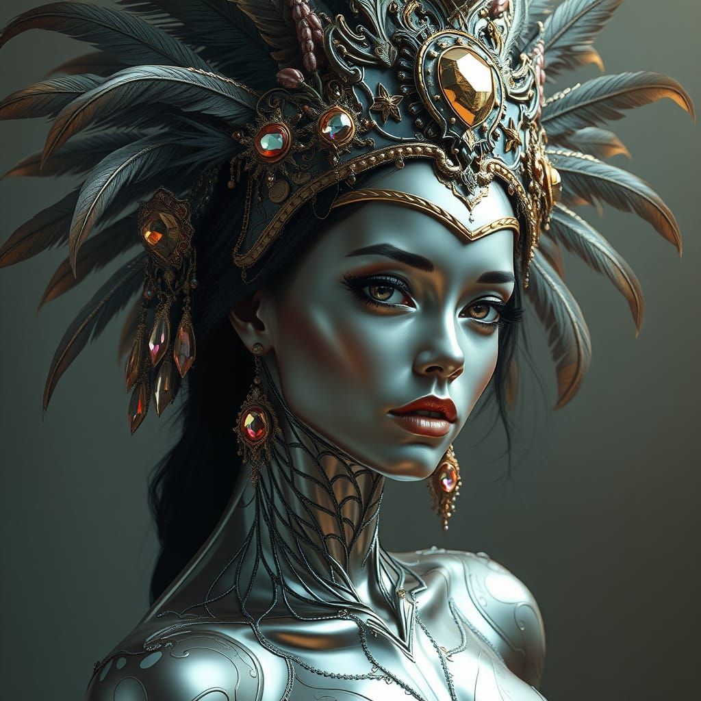 This image shows a woman's portrait with metallic skin, wearing an ornate hat decorated with gems and feathers. The art style evokes futuristic digital artwork.