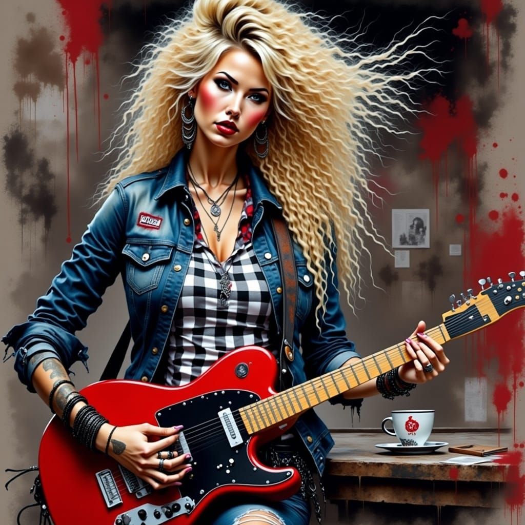 A vibrant oil painting showing a beautiful woman playing guitar. The woman wears a checkered shirt, ripped jeans, a denim jacket and bracelets, complemented by her long, messy blond hair in a grunge aesthetic.