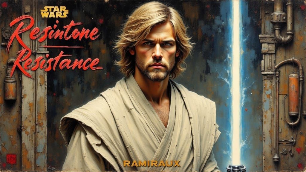 A photorealistic portrait of Luke Skywalker, looking angrily at the camera with a blue lightsaber. Features dramatic lighting and a painterly, surreal atmosphere.