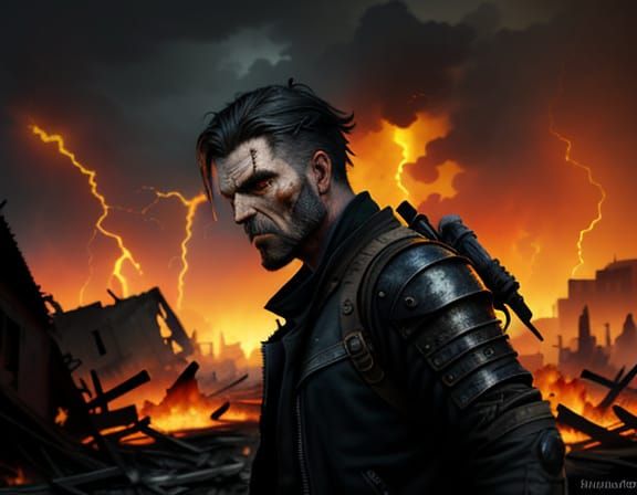 This image shows a disfigured survivor amidst post-apocalyptic ruins. Fiery embers glow under dark skies, illuminated by warm lighting and dramatic shadows. Rendered as highly detailed 3D digital art.
