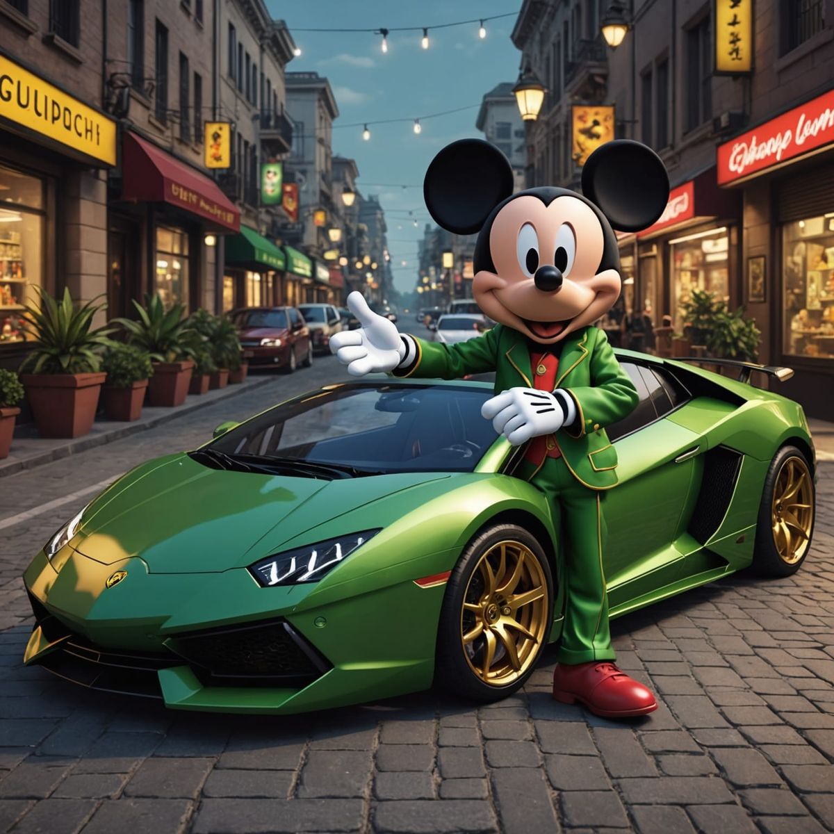 This image portrays an ultra-realistic Mickey Mouse in a luxurious setting. He is dressed in Gucci clothing, smoking cannabis, and standing in front of a Lamborghini, rendered with cinematic lighting.